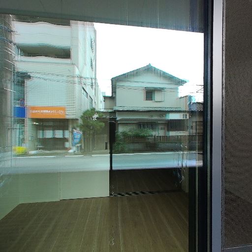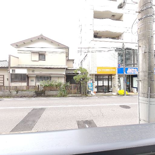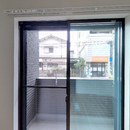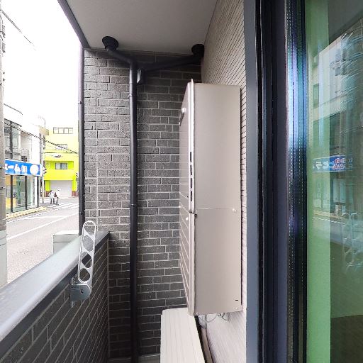 通りに面したバルコニー(確度84%):バルコニー越しに道路と向かいの建物が近く、低層階で車や歩行者の往来が見える。