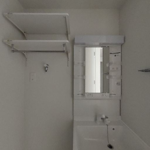 独立洗面台と収納棚(確度90%):ミラー付き独立洗面台があり、上部・サイドに小物収納がついている。左壁には可動式のオープン棚が2段ある。