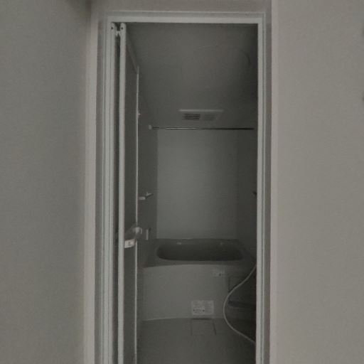 浴室が近接しているユニット構成(確度88%):洗面所から直接出入りできる浴室ドアと浴槽が見える。