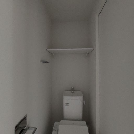 トイレ上部の収納棚(確度86%):便器の上に浅めのオープン棚が1段設置されている。トイレットペーパーや掃除用品を置ける。