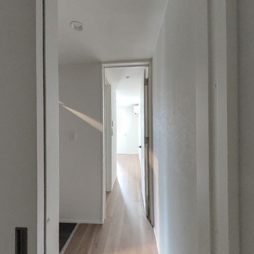 廊下の奥行きと動線(確度71%):細長い廊下で、先に居室が続くレイアウト。右側に室内ドアがあり、動線は一直線。
