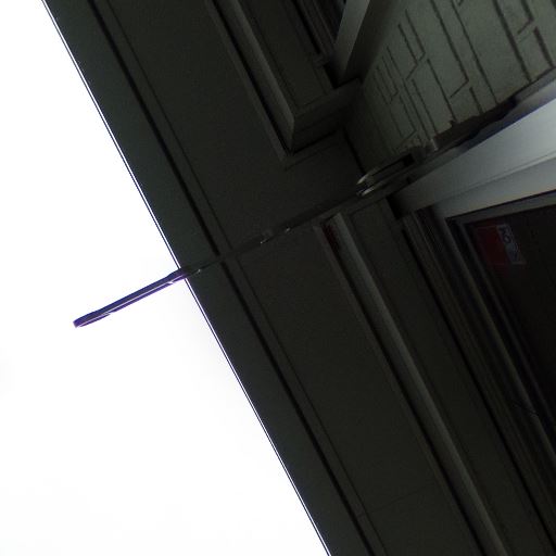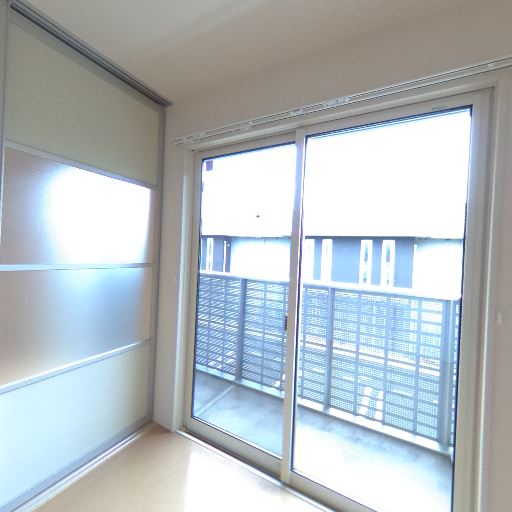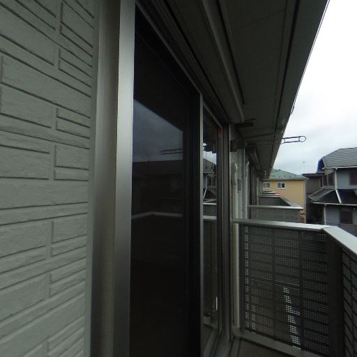• 低層集合住宅の共用通路に面した1階住戸(確度84%):バルコニー前が共用通路で、掃き出し窓とフェンスの内側に室外機や物置スペースがある。