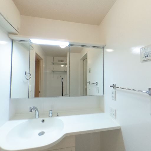 • 洗面台と三面鏡収納(確度86%):曲線的なボウル一体型カウンターの洗面台と三面鏡キャビネットがあり、鏡裏収納が期待できる。