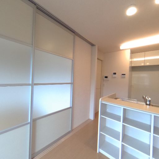 • 収納とスライド扉(確度78%):キッチン背面と上部に吊戸棚があり、リビング側には大きめのスライド扉の収納(もしくは個室仕切り)が見える。