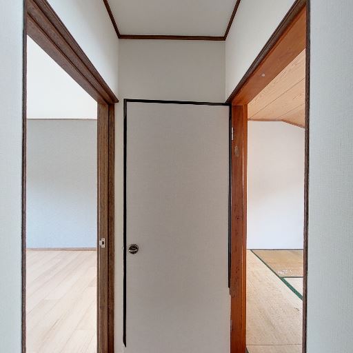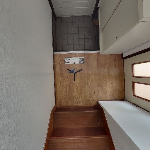 • 階段ホールに面した通路(確度74%):中央に引き戸(または片開き戸)があり、左右は別室へつながる開口。木枠や建具はやや年季を感じるが大きな破損は見えない。