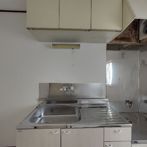 • キッチン設備の状態(確度83%):シンク一体型のステンレス天板と壁付け水栓。上部吊戸棚あり。換気フード周辺の金属部に錆びや汚れが見える。