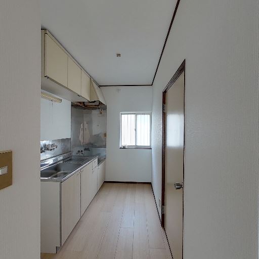 • キッチンは縦長で作業スペース広め(確度78%):流しとコンロが一直線に並ぶI型キッチンで、通路幅に余裕があり作業しやすそう。吊戸棚・下部収納も確認できる。