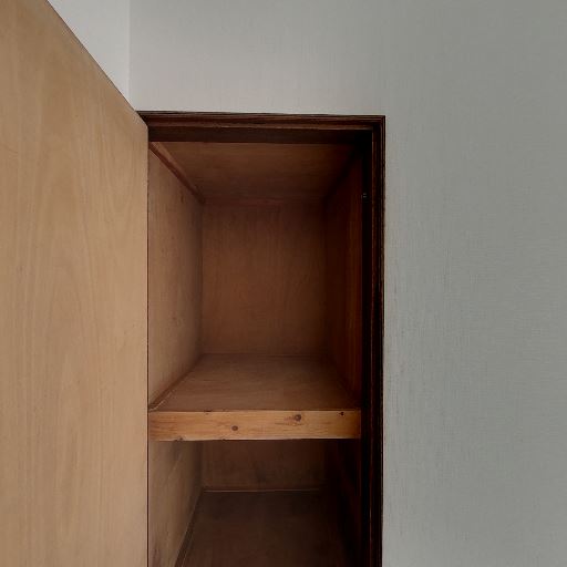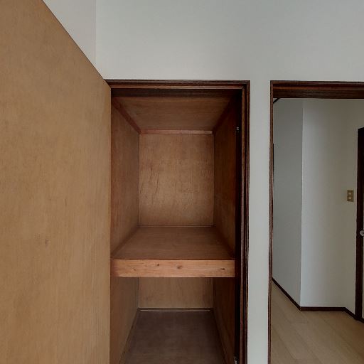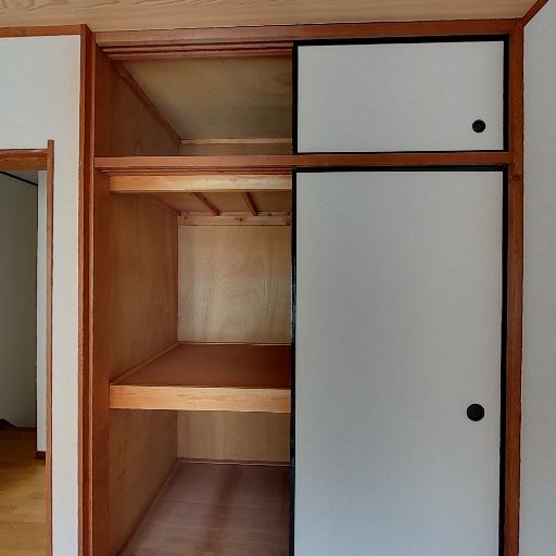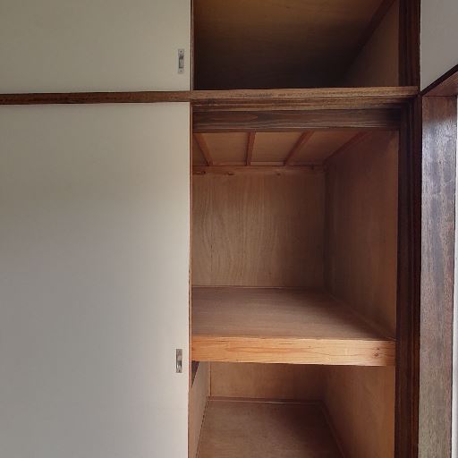 • 押入れ型の収納(確度86%):木製の奥行きある収納があり、中段の棚で上下に分けて使える。