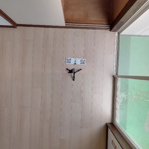 • 室内と外部との段差・床の状態(確度62%):窓際の床はフラットで、外部側はコンクリート土間。床材は明るいフローリング調で傷は目立たない。