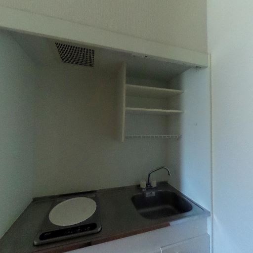 ミニキッチン付きで最低限の自炊は可能(確度93%):コンパクトなシンクと単口コンロ、上部棚が確認できるため、簡単な調理や洗い物に対応できる設備構成と見られる。