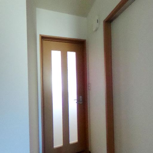 室内扉の採光で廊下まわりが明るい(確度80%):細長いガラス入りの室内扉から光が入っており、閉めた状態でも暗くなりにくい印象を受ける。