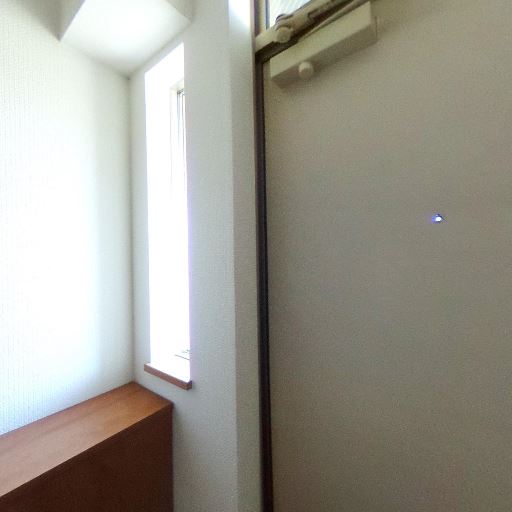 玄関に自然光が入る(確度94%):玄関横の縦長窓から強い自然光が入っており、玄関まわりが明るく見える。