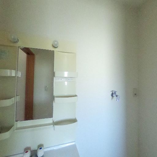 洗濯機置き場が室内にある(確度95%):床面に洗濯機パンと給水栓が確認でき、洗濯機置き場が室内の洗面脱衣スペース内に設けられている。