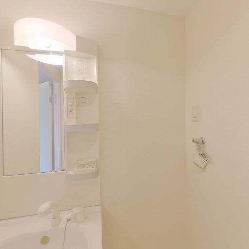 • 洗面台まわりに最低限の収納がある(確度88%):鏡横に棚付きの洗面ユニットがあり、洗面用品を置けるスペースが確保されている。