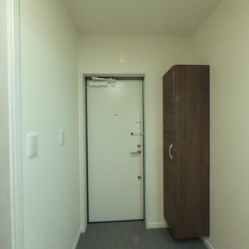 • 玄関収納が備え付けられている(確度93%):玄関扉の横に縦長の収納家具が設置されており、靴や小物の整理に使えると考えられる。
