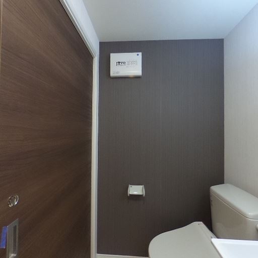 • トイレはアクセントクロスで見た目が引き締まっている(確度80%):トイレ正面の壁が濃色のアクセントクロスになっており、空間に単調さが少なく、比較的落ち着いた印象を与えている。