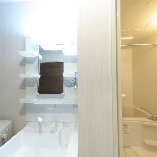 • 洗面台に収納棚があり細かい物を置きやすい(確度83%):鏡まわりにオープン棚があり、洗面用品やスキンケア用品などを手の届く位置に置ける仕様に見える。