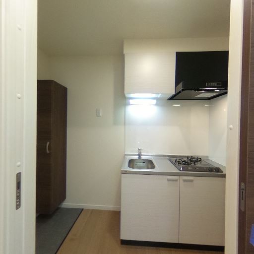 • キッチンはコンパクトだが2口コンロで自炊しやすそう(確度92%):小ぶりなキッチンながら、シンクと2口ガスコンロ、レンジフードが確認でき、一人暮らし向けとしては基本的な調理機能が揃っている。