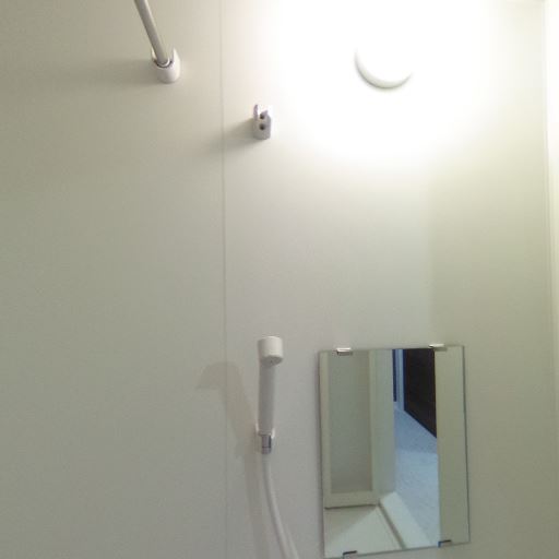 • 浴室内に鏡とシャワーがあり基本設備は揃っている(確度93%):壁面に小型の鏡とシャワーヘッドが確認でき、日常使用に必要な最低限の浴室設備は備わっている。