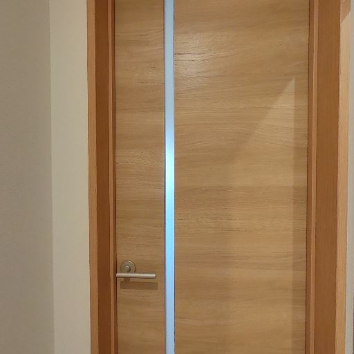 室内ドアの採光スリット(確度78%):木目の室内ドアに縦長の採光スリットがあり、廊下側へわずかに光が入っている。