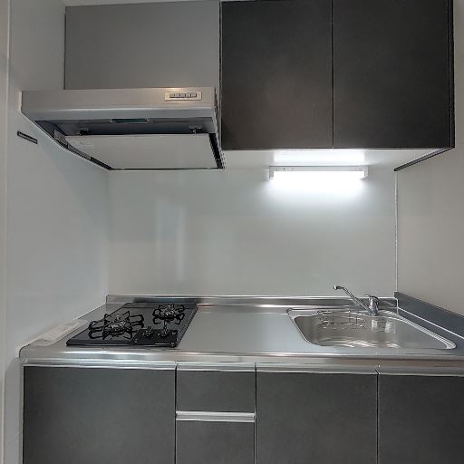 コンパクトなシステムキッチン(確度86%):2口ガスコンロ、シングルレバー水栓、上下収納とレンジフードが揃った省スペース型。作業スペースはやや狭め。