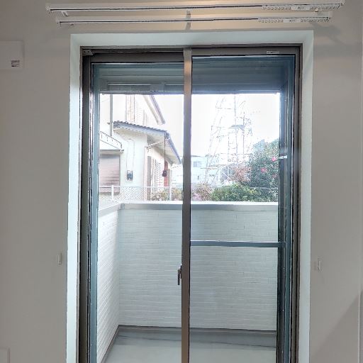 室内物干しポールのレール(確度74%):掃き出し窓上部に天井付の物干しレールが設置されている。