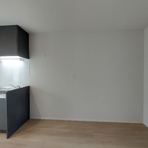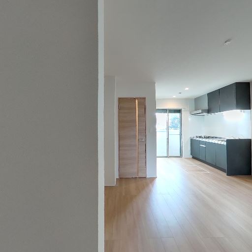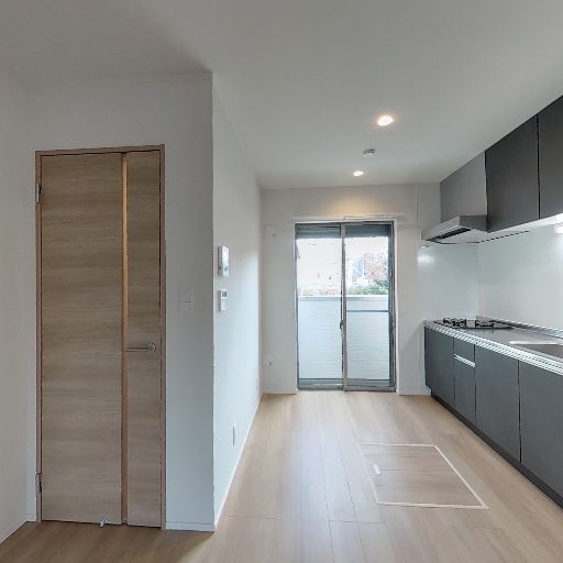 キッチンとリビングが一体のレイアウト(確度87%):壁付けの直線型システムキッチンが設置され、同じ空間にリビングダイニングが続く。