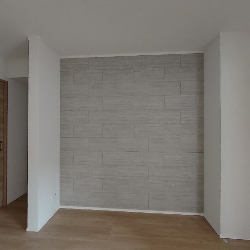 アクセントクロスのある壁面(確度86%):グレー系のタイル調アクセントクロスが一面に施工されている。