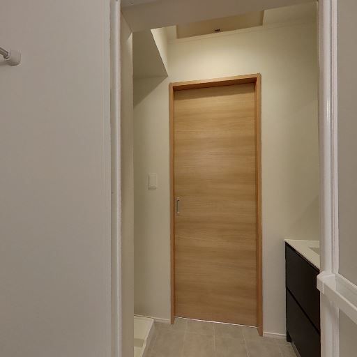 洗面室との動線良好(確度72%):浴室の外に引き戸と洗面・脱衣スペースが見える。
