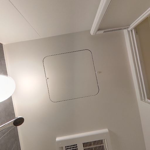 換気設備と照明(確度77%):天井にダウンライトと換気扇(点検口付近)が見える。浴室側にも換気口がある。