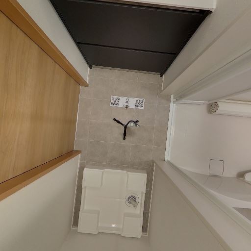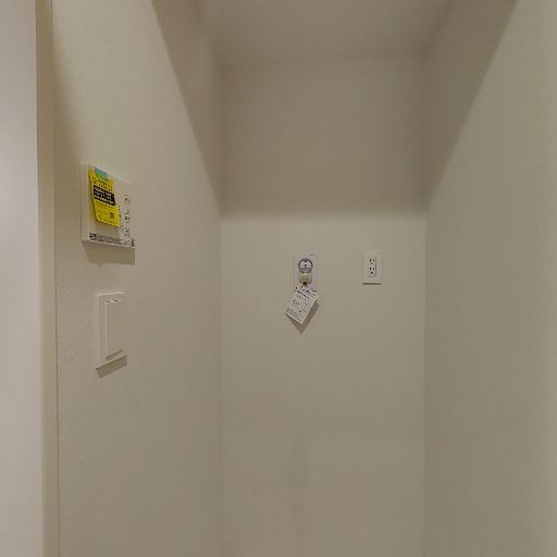 洗濯機置き場あり(確度86%):壁面に給水栓とコンセント、床に防水パンが設置されている。