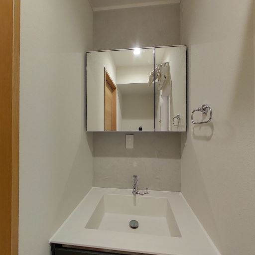 独立洗面台と三面鏡収納(確度88%):シンプルなボウル一体型の独立洗面台があり、上部は三面鏡で内部収納が期待できる。