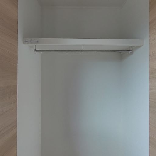 クローゼット収納あり(確度86%):ハンガーパイプと上部棚を備えたクローゼットが設置されている。