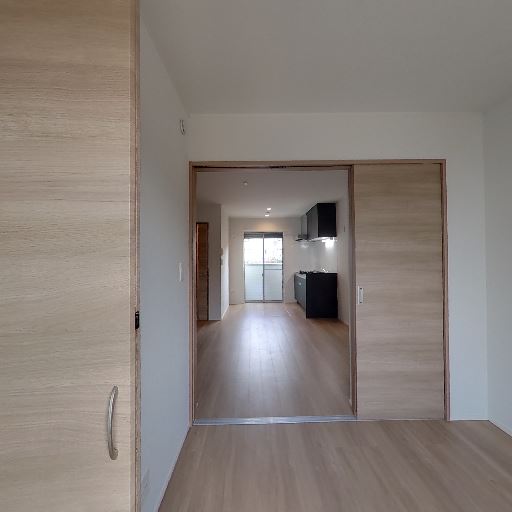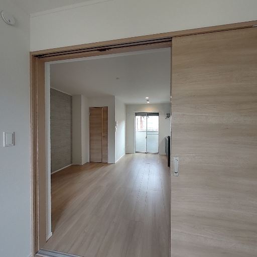引き戸でつながる続き間(確度79%):木目の引き戸の先にキッチン・ダイニングが見え、個室とLDKがフラットに繋がっている。段差は見当たらない。