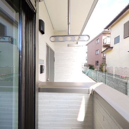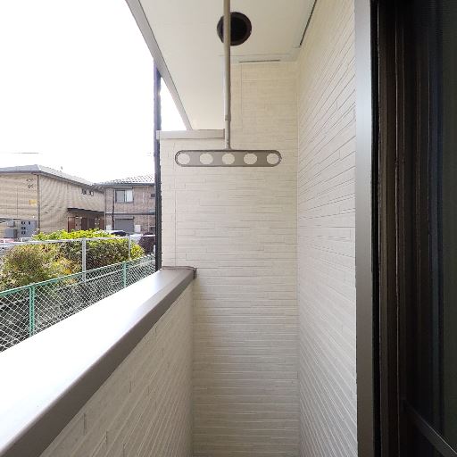 バルコニーあり(物干し金物付き)(確度92%):細長いバルコニーに天井吊りの物干し金物が設置されている。洗濯物を外干しできる。