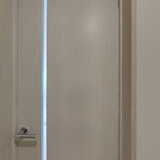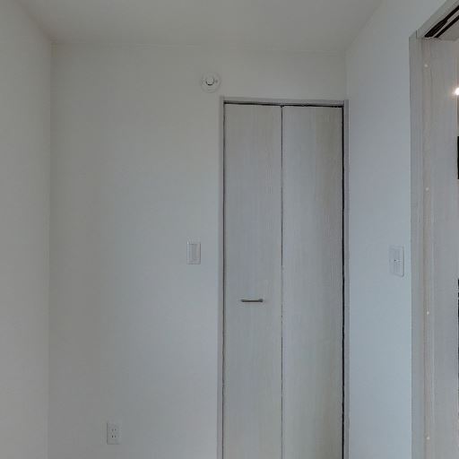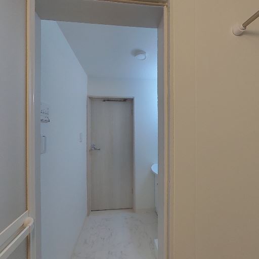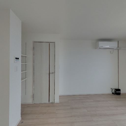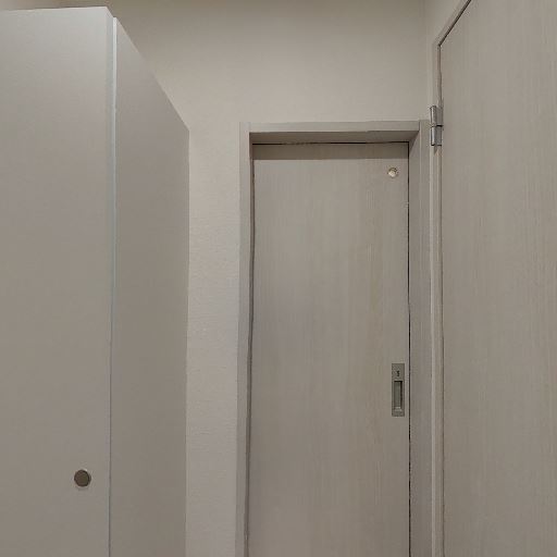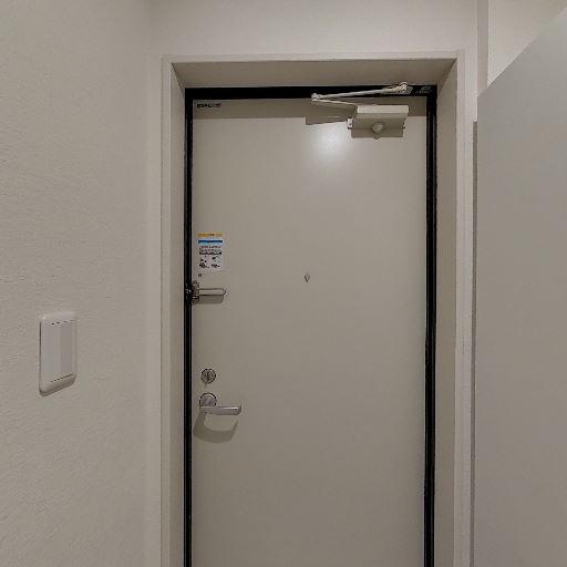 収納または設備用の扉が複数あり機能的(確度72%):右画像に大きめの収納扉らしき面があり、室内ドアも複数確認できるため、玄関周辺に収納や水回りなどがまとまっている構成と推測される。