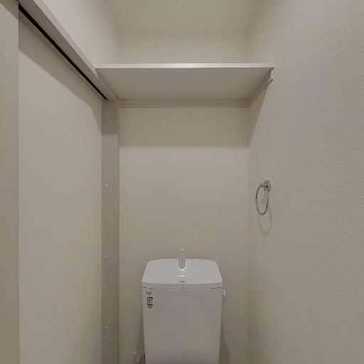 上部棚付きで収納性がある(確度91%):トイレ上部に幅いっぱいの棚が設置されており、トイレットペーパーや掃除用品の置き場として使えそうです。