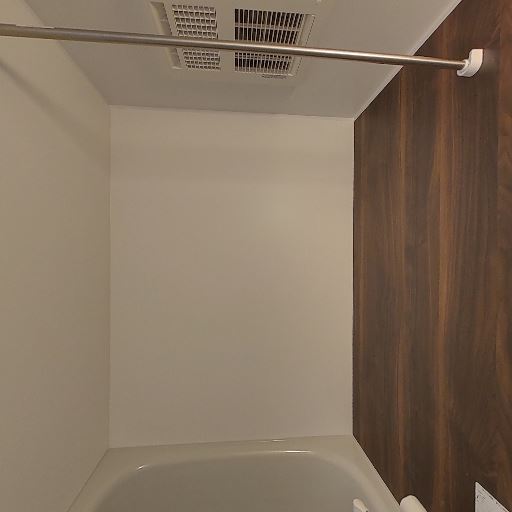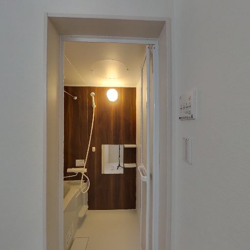 浴室乾燥・換気に期待できる(確度78%):天井部に換気口・設備パネルが確認でき、浴室換気または浴室乾燥機能付きである可能性が高い。湿気対策や洗濯物の室内干しに有利と考えられる。