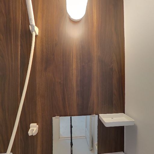 木目アクセントパネルで内装の印象が良い(確度93%):浴室の一面に木目調パネルが使われており、白基調の空間に比べてデザイン性がある。単調になりにくく、見た目の質感向上に寄与している。