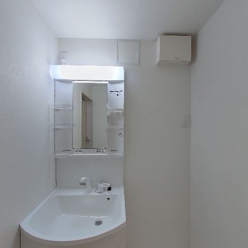 洗面化粧台が新しめで清潔感がある(確度89%):front画像では白基調の洗面台と鏡まわりの収納が整っており、全体として使用感が強すぎない印象を受ける。