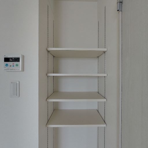 可動棚付きの収納スペースが便利そう(確度93%):壁面に可動棚が設けられており、日用品や食品ストックなどを置く収納として使いやすそうである。
