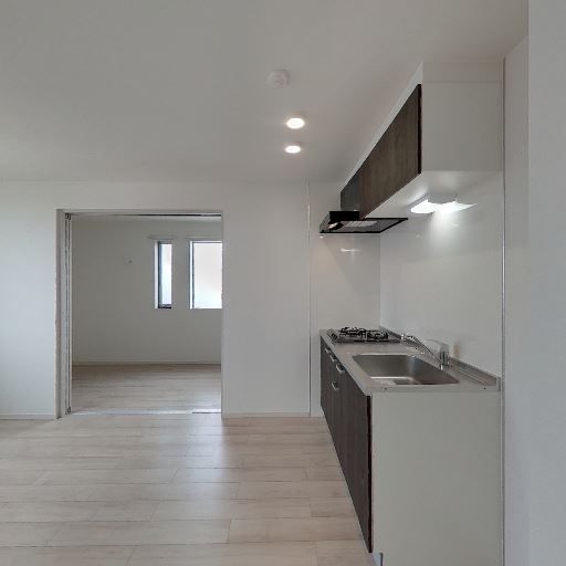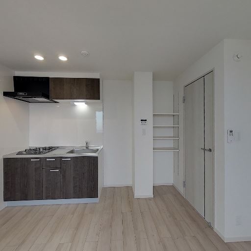 内装が全体的に新しめで清潔感がある(確度80%):白い壁と明るい木目調フローリング、キッチン設備の状態から、全体として比較的新しめで整った印象を受ける。目立つ汚れや大きな損傷は見当たらない。