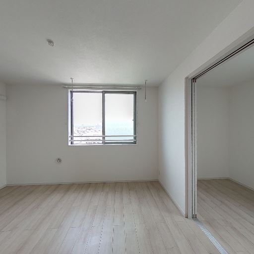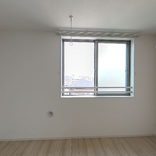 明るく開放感のある居室(確度91%):主室は白基調の内装と大きめの窓により、室内全体が明るく見える。床面も見通しがよく、圧迫感は比較的少ない。