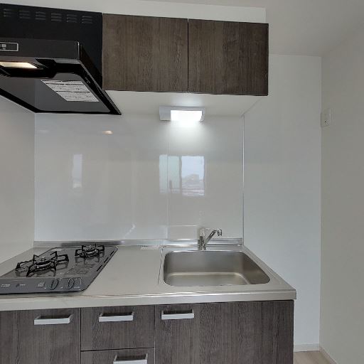キッチンがコンパクトにまとまっている(確度90%):片側壁付けのキッチンが設置されており、シンク・コンロ・換気扇・上部収納が確認できる。限られた面積の中で必要設備は揃っている。