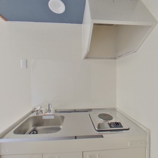 キッチンは最小限サイズ(確度78%):シングルシンクの小型キッチンが壁際に配置されている。調理スペースは限られそう。