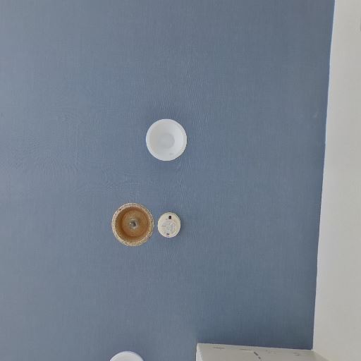 天井色のアクセント(確度78%):天井がブルー系で塗装され、照明器具と火災報知器が見える。