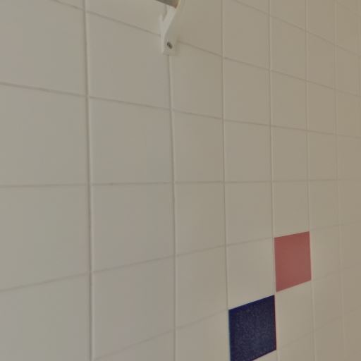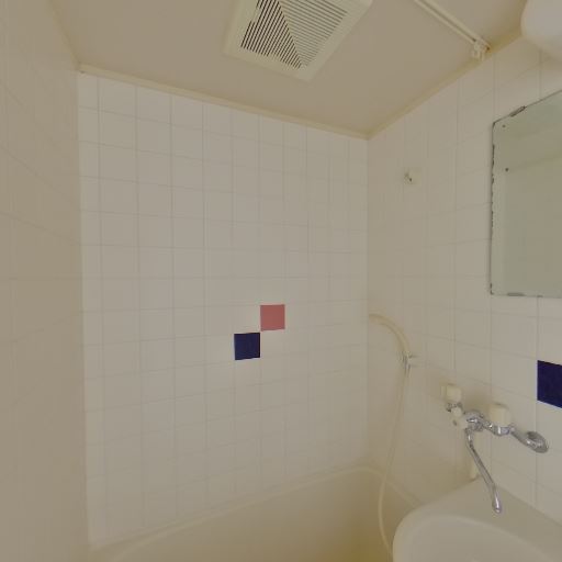 タイル壁の状態(確度78%):白タイルにピンクとネイビーのアクセント。大きなひび割れは見当たらない。