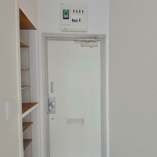 玄関ドアと設備の状態(確度78%):玄関ドア上部にブレーカー(分電盤)があり、ドア周りは比較的きれい。郵便受け口やドアクローザーも確認できる。左側に可動式の棚があり、靴収納として使えそう。