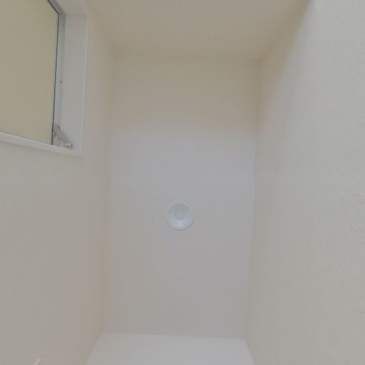 室内洗濯機置き場あり(確度80%):防水パンと排水口が見え、上部に小窓がある。換気がしやすい配置。