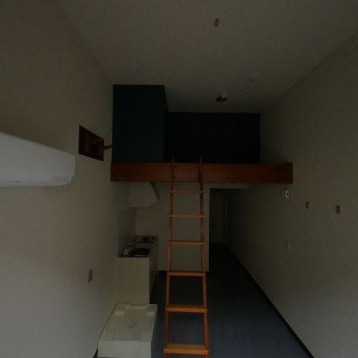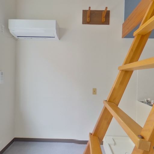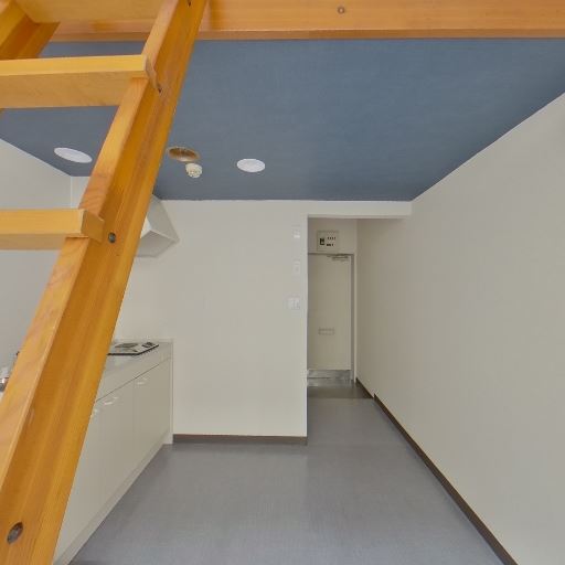 ロフトへのはしごと高天井(確度82%):部屋中央にロフトへ上がるはしごが設置され、天井が高めに見える。